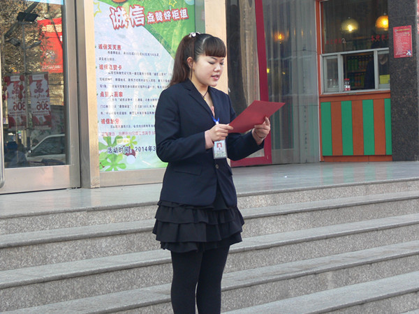 3月15日早8點30分,商場在廣場上舉行了《誠信宣言》大會。商場副總經理王建國、魏新平、曹志強、朱春燕,監(jiān)事會主席劉玉榮及機關、樓層部經理代表參加了活動。