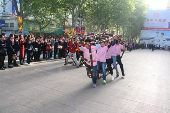 今年的財源滾滾比賽和往年規(guī)則相同,都是以五人團(tuán)隊在相同距離用時最短者為勝;不同的是道具不同,去年的道具是商場用PVC管材特別制作的,不容易損壞,并且,提前讓各個參賽隊做了賽前訓(xùn)練。