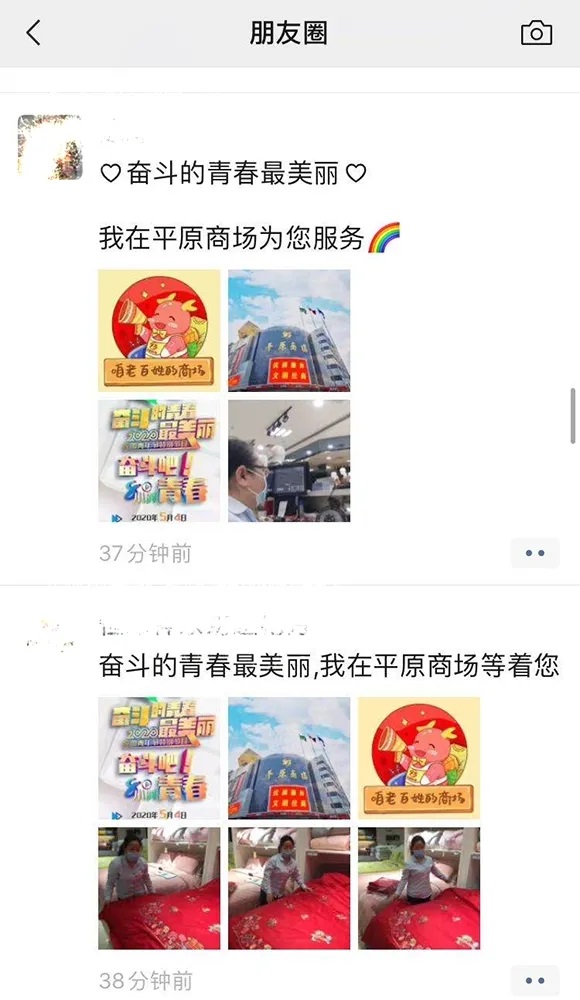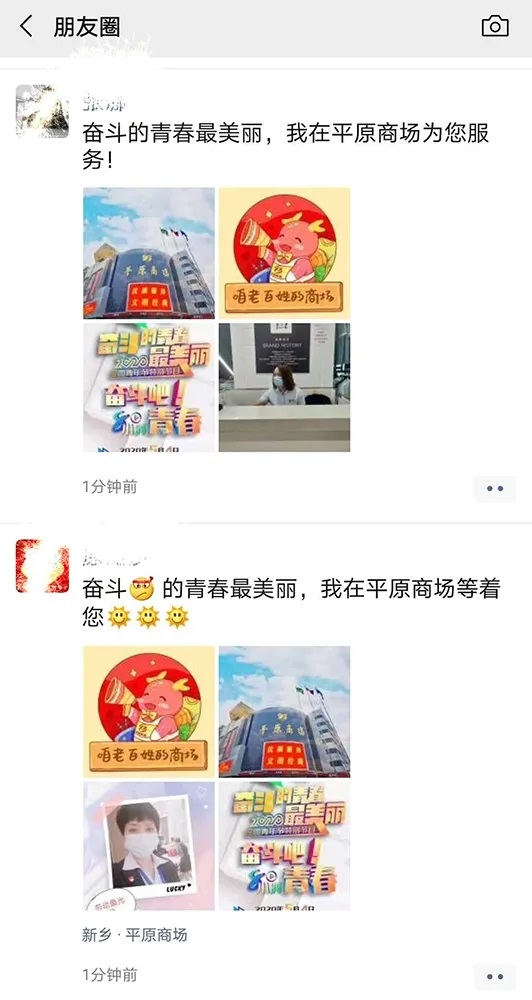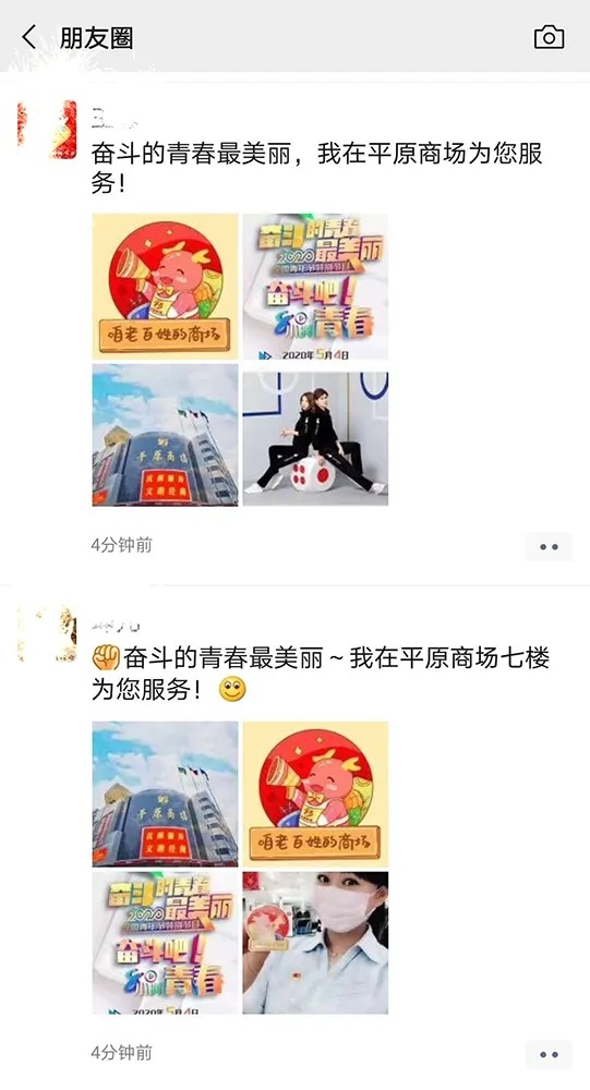 青春是一團(tuán)火,它點(diǎn)燃了我們沸騰熱血;青春是一面旗,它召喚著我們勇敢前行。無奮斗,不青春——今天上午10點(diǎn)30分,商場組織團(tuán)員青年以“奮斗的青春最美麗,我在平原商場為您服務(wù)”為五四宣傳日主題,在微信朋友圈發(fā)起青春接龍。凝聚平原力量,綻放青春風(fēng)采,我們,正當(dāng)紅!